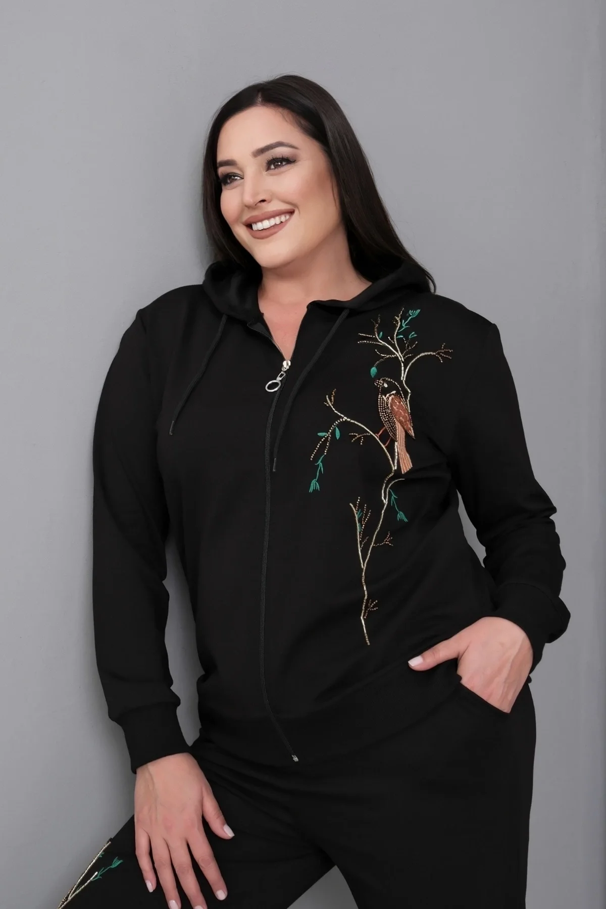 Kapüşonlu Fermuarlı Boncuk Nakışlı Takım