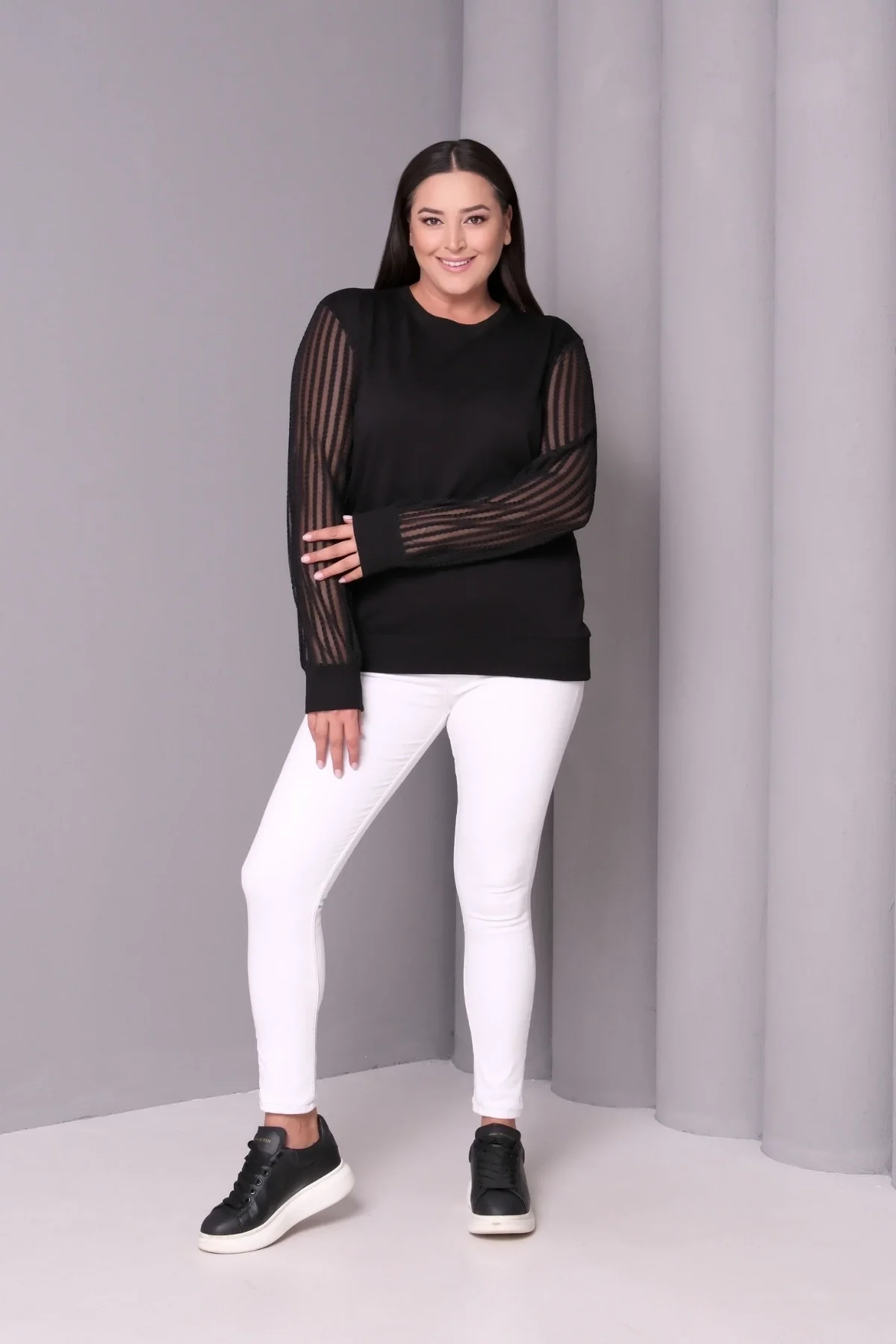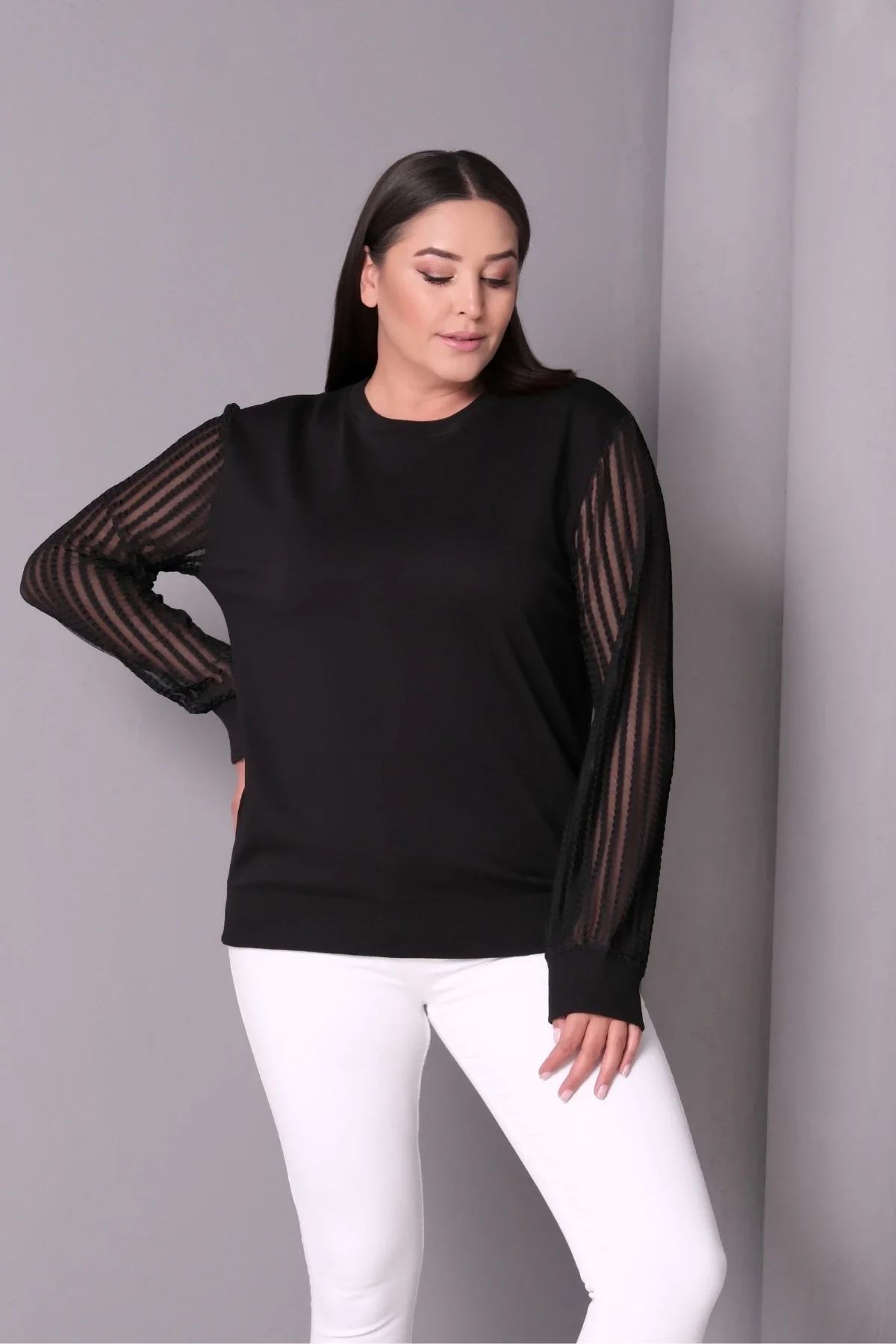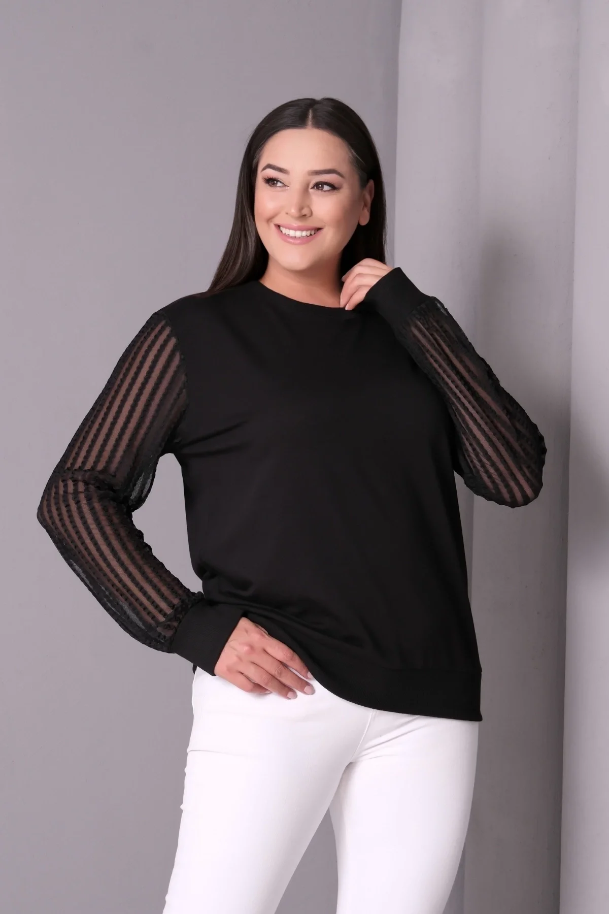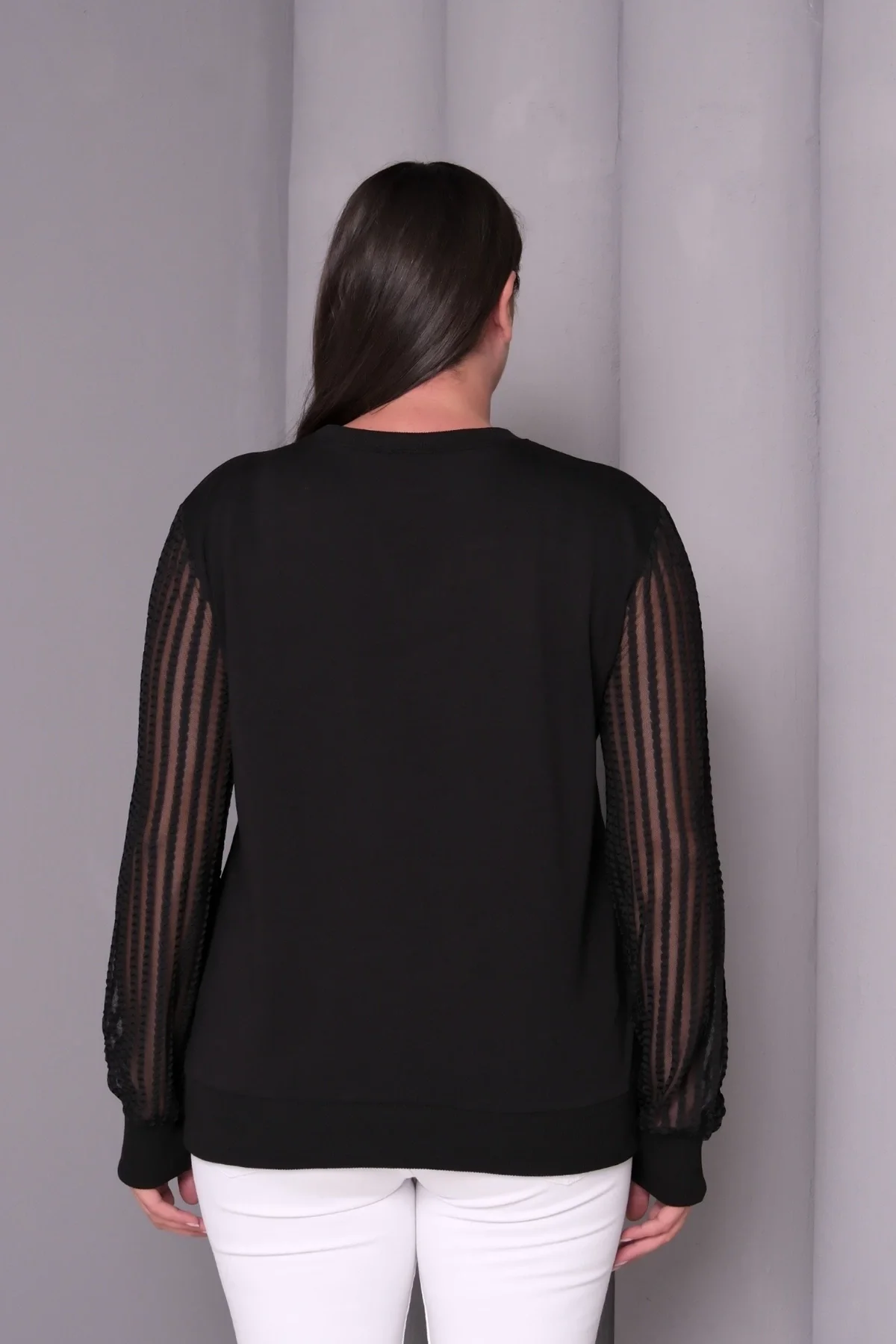 Aytemas Kolları Desenli Tül Bluz, şıklığı ve rahatlığı bir araya getiriyor. Büyük beden olarak tasarlanan bu bluz, kollarndaki tül detaylarıyla dikkat çekiyor. Hem günlük kullanıma hem de özel günlerde tercih edebileceğiniz şık bir parça olan bu sweatshirt, konforuyla da vazgeçilmeziniz olacak.