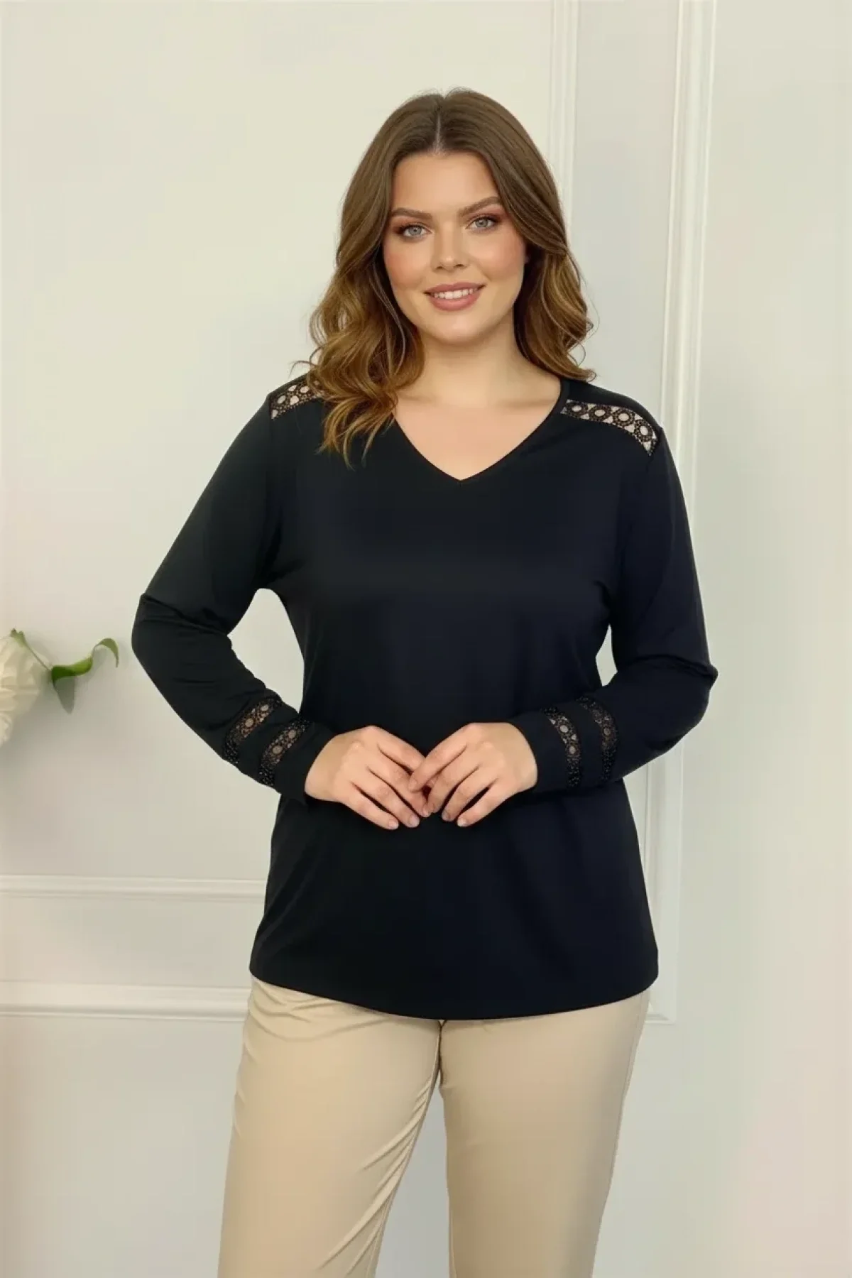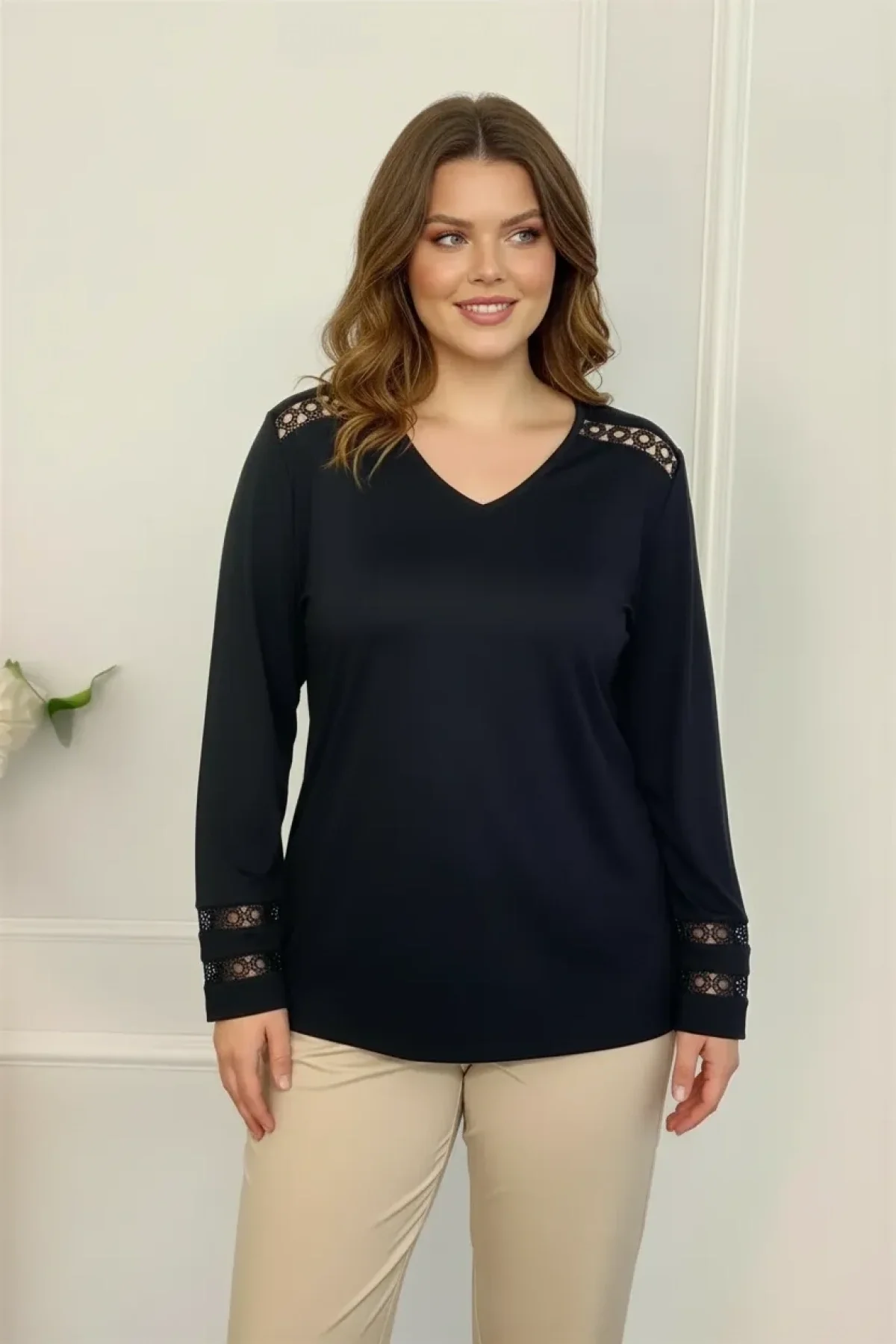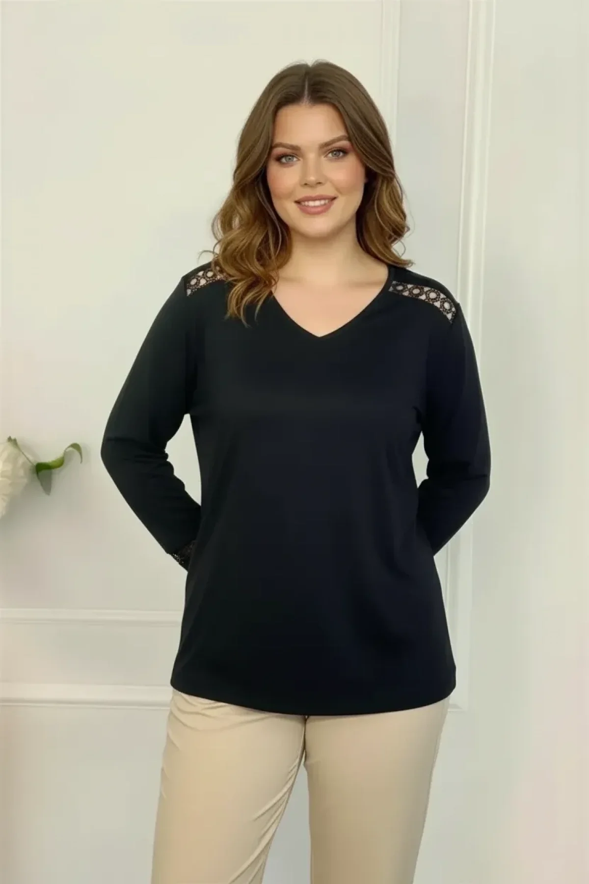 Yeni sezonun şık ve zarif parçası Aytemas Omuz ve Kolları Güpür Detaylı Bluz, büyük bedenleri şıklıkla buluşturuyor.