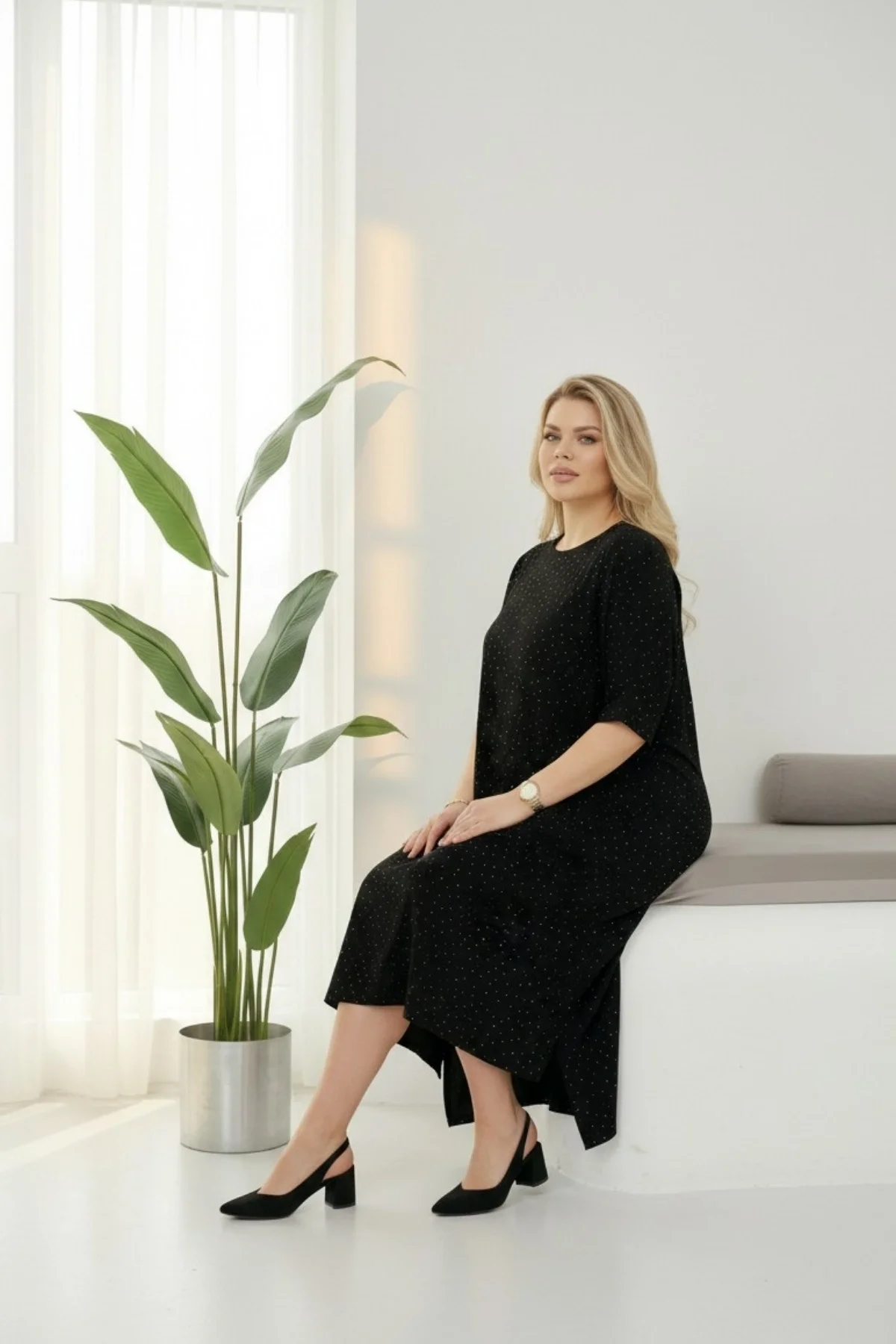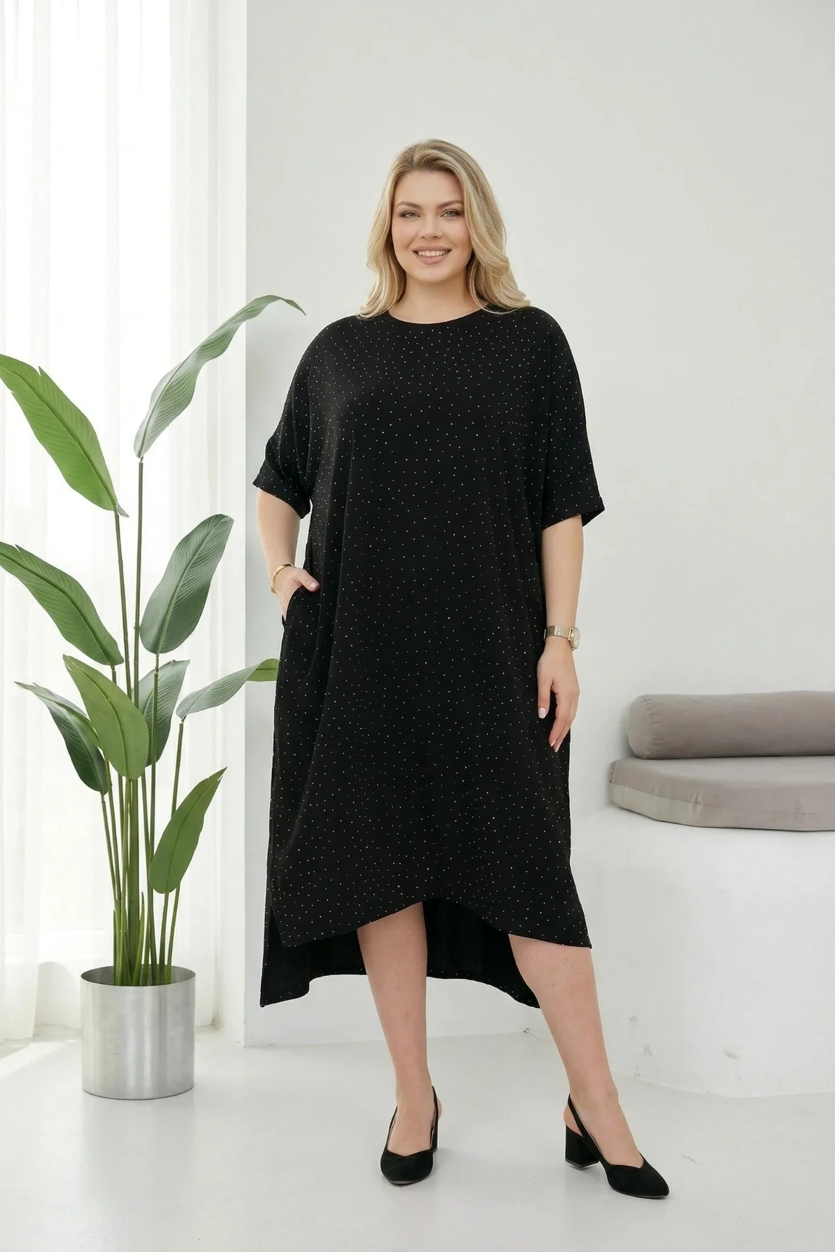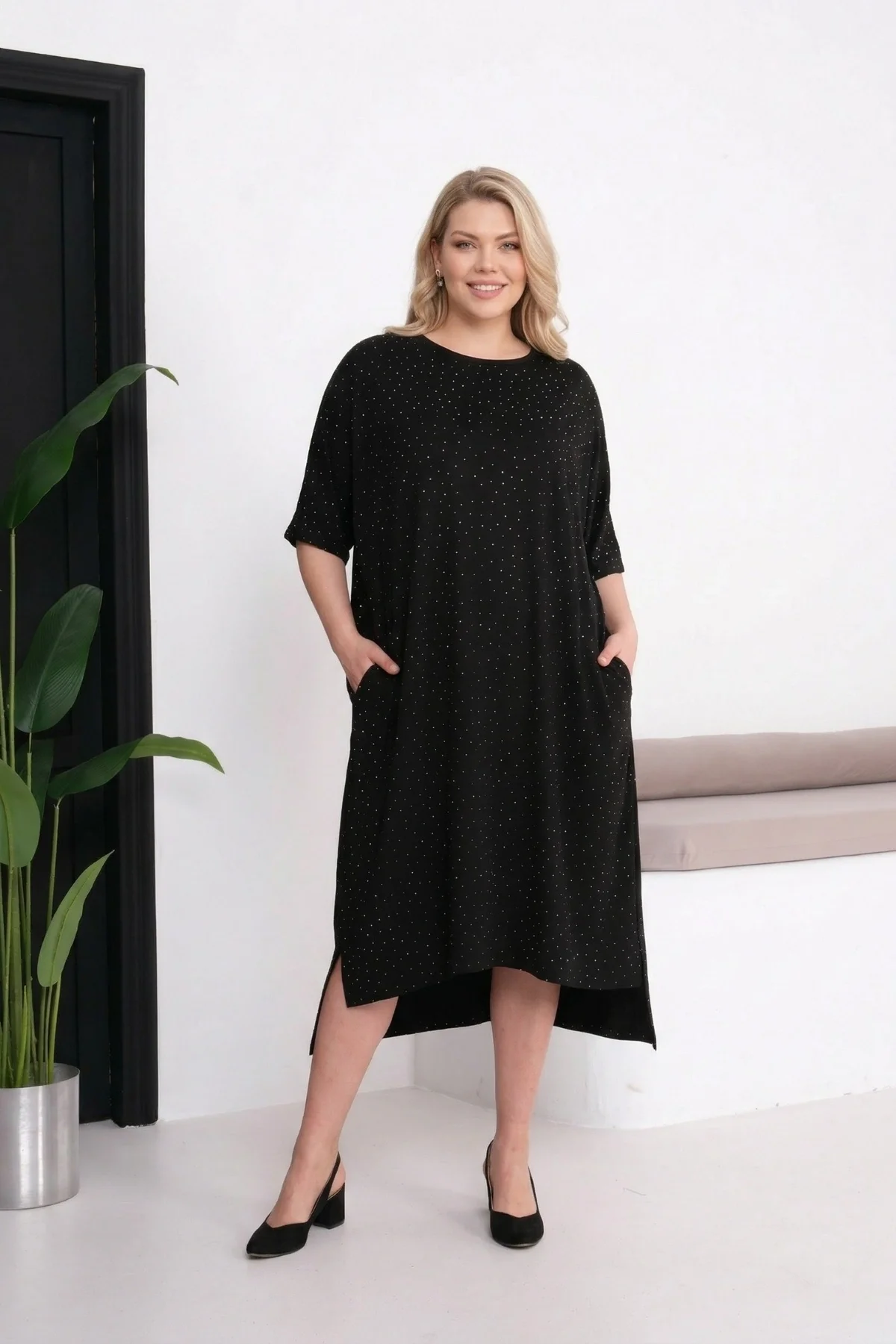 Taş Baskılı Cepli elbise, Aytemas kalitesi ile şıklığı ve rahatlığı bir araya getiriyor. Bu büyük beden elbise, geniş yarasa kollara sahip tasarımı ile dikkat çekiyor.
