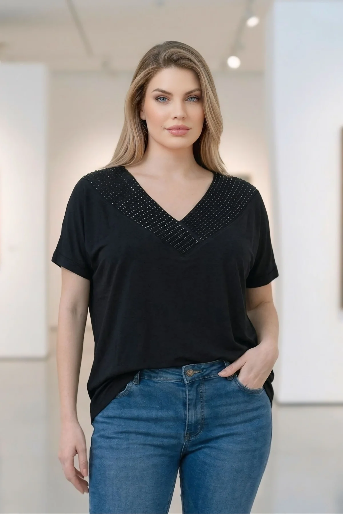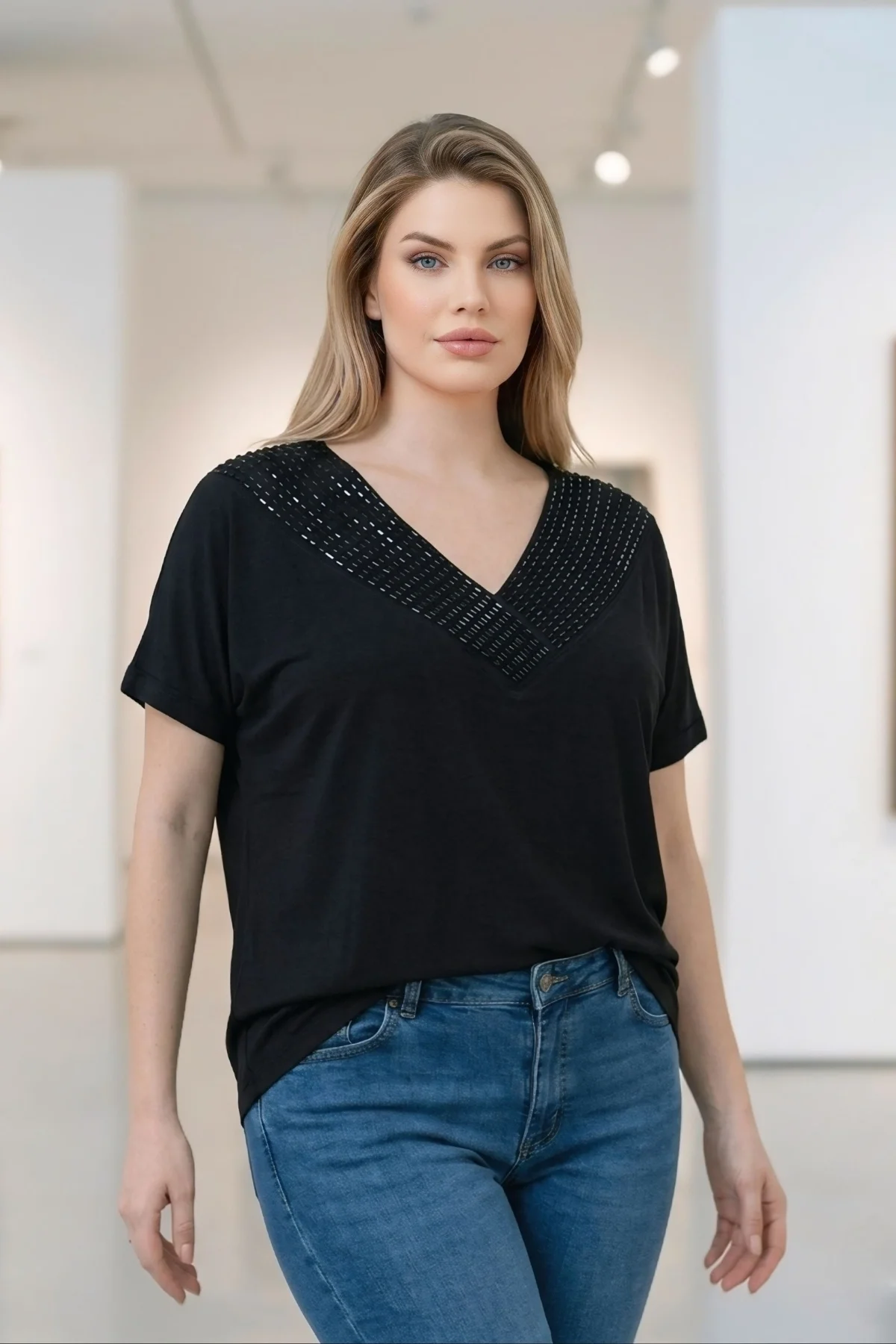 • Aytemas V Yaka Taş Detaylı Büyük Beden Bluz, şıklığı ve rahatlığı bir arada sunuyor.