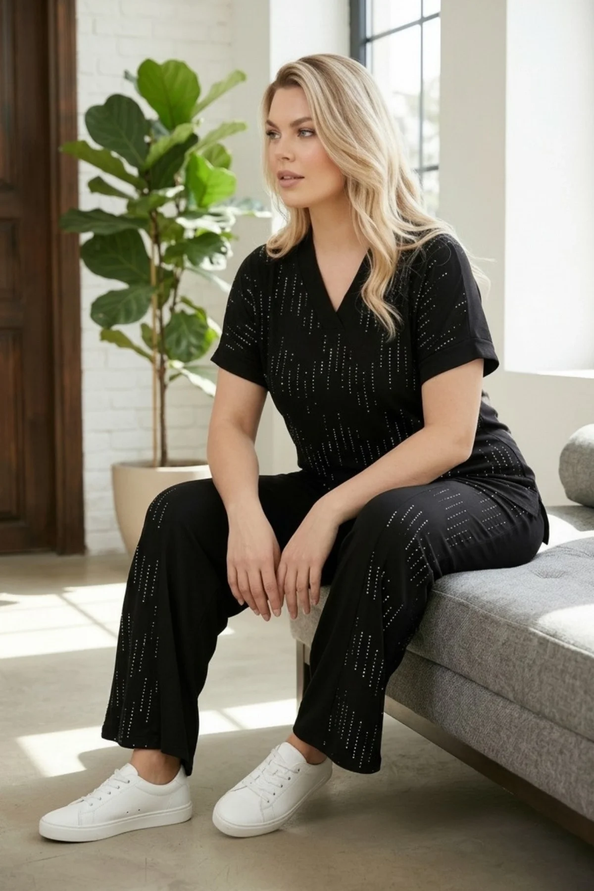 Aytemas V Yakalı Taş Baskılı Takım, şıklığı ve konforu bir arada sunar.